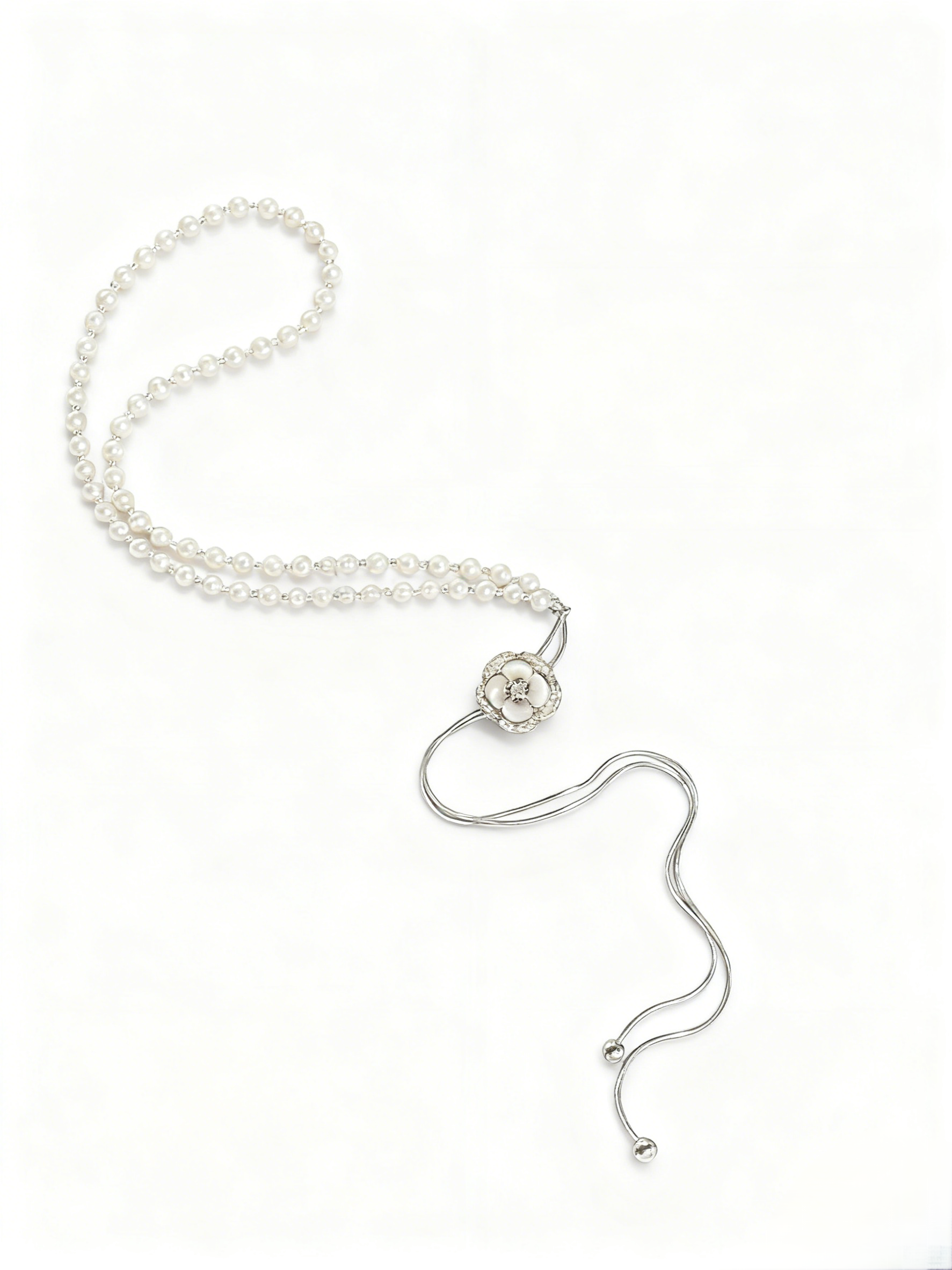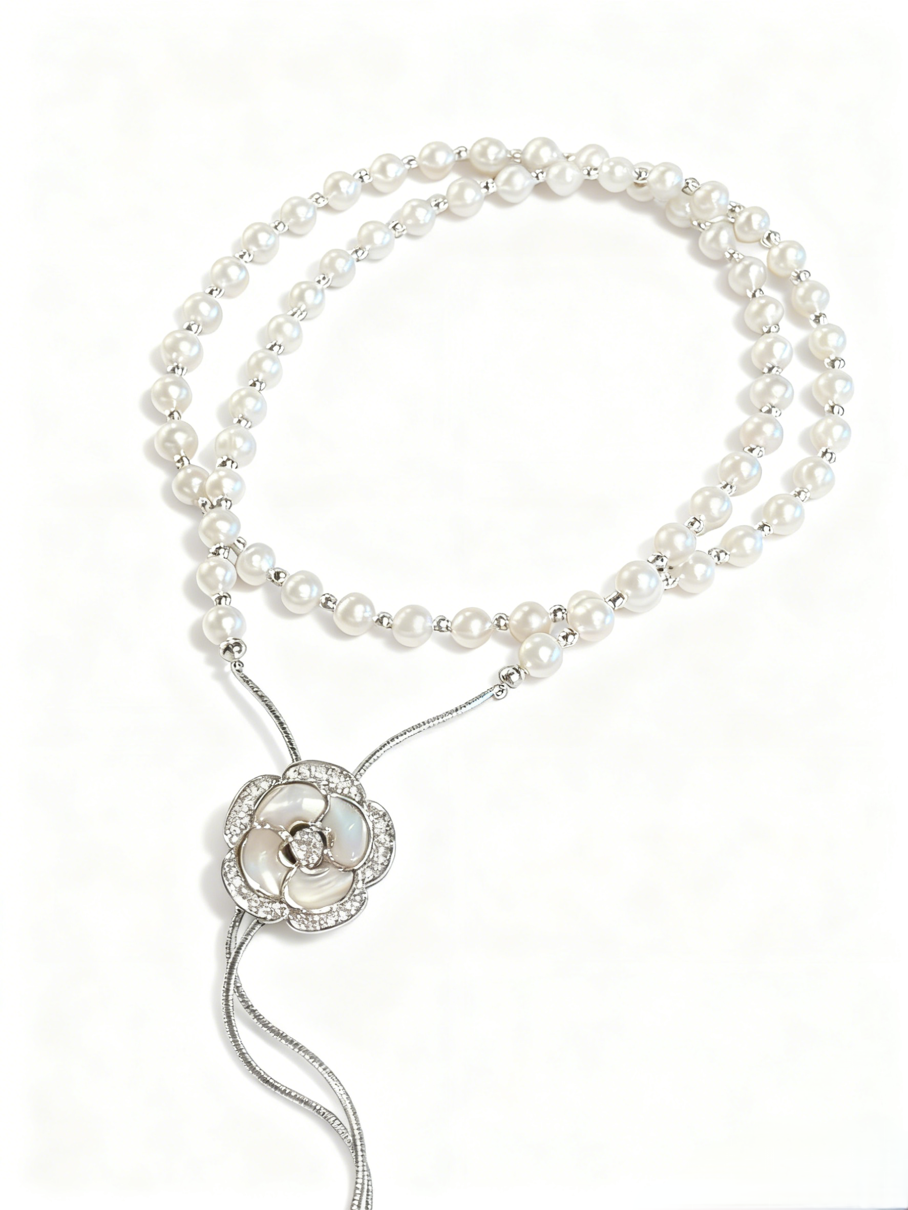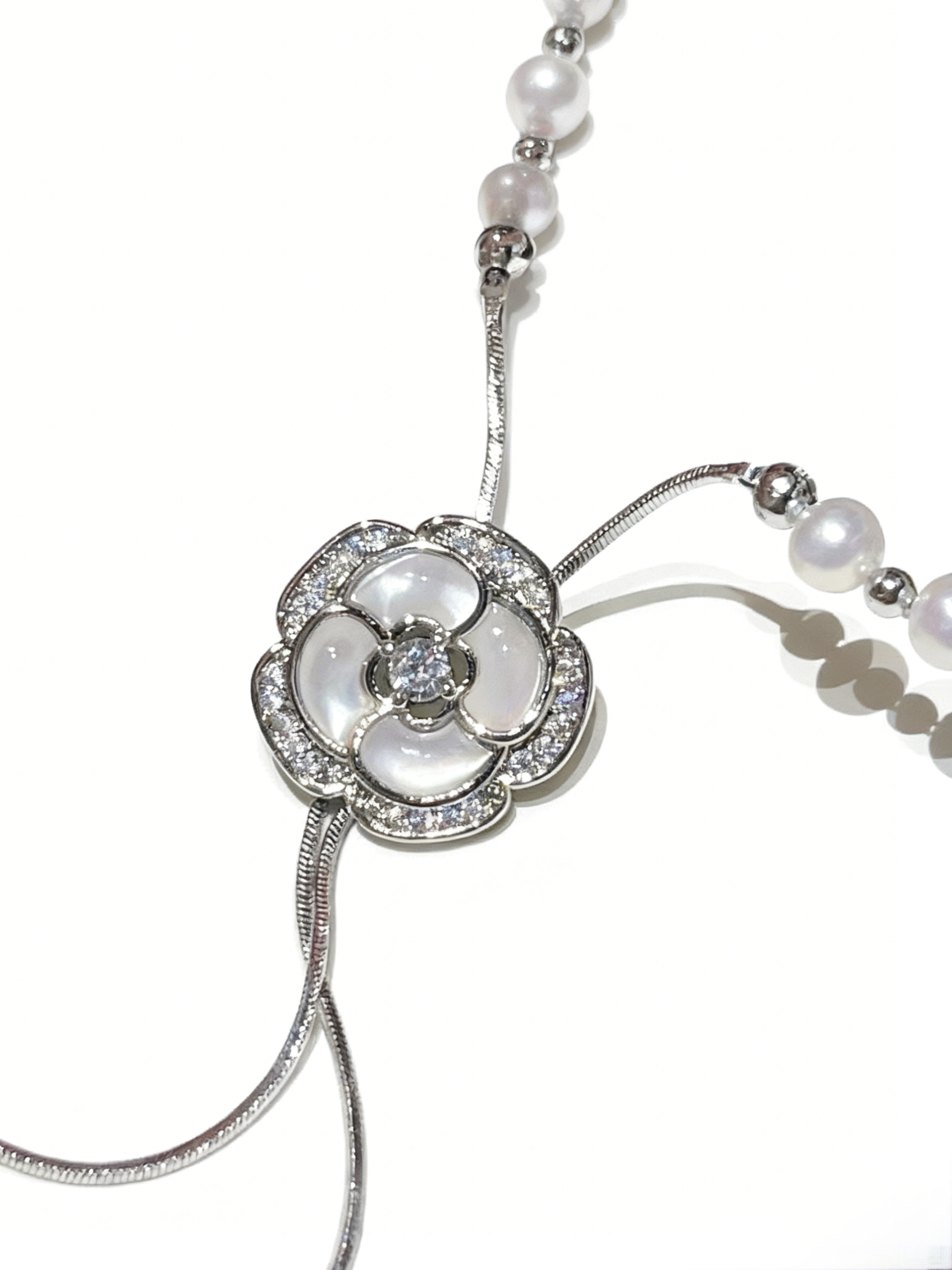 Natural white mother-of-pearl outlines camellia petals, interspersed with 4-5mm natural pearls. The snake bone chain naturally cascades into an elegant arc, measuring approximately 80cm in total length.