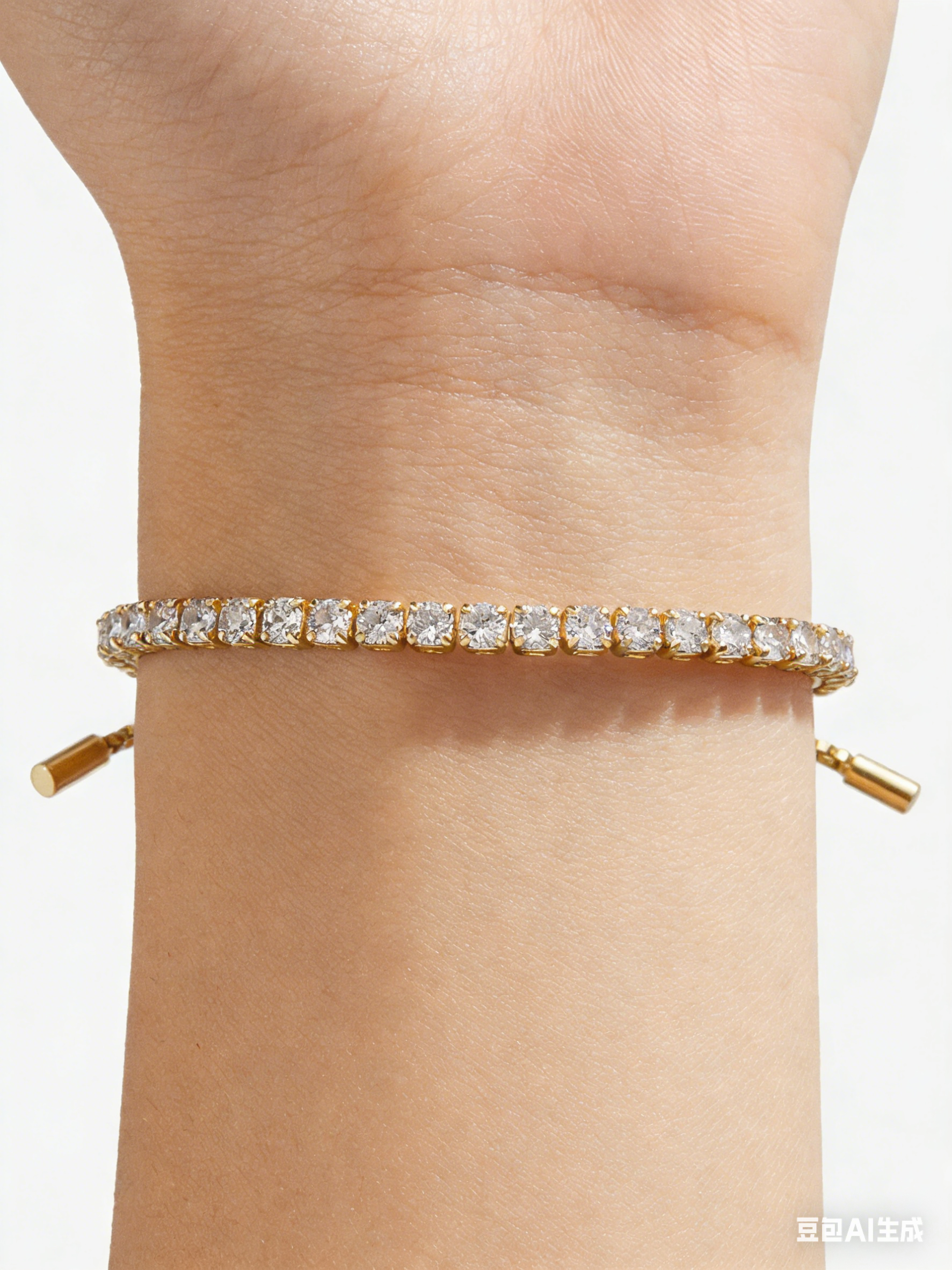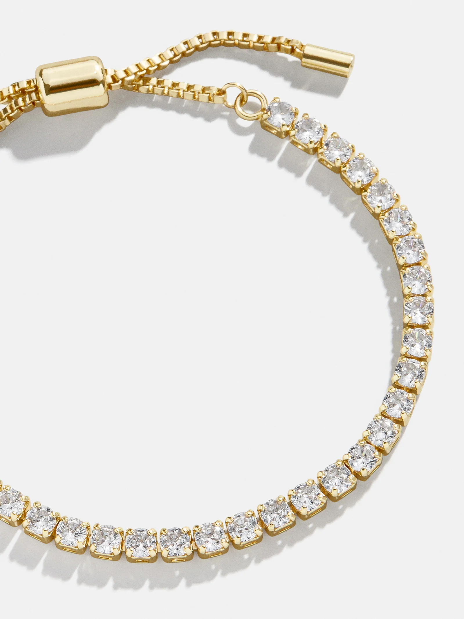 This tennis bracelet features an easy-to-wear pull-tie closure, ensuring a perfect fit every time you wear it. It is adorned with a row of cubic zirconia crystals set on a beautiful gold chain.
